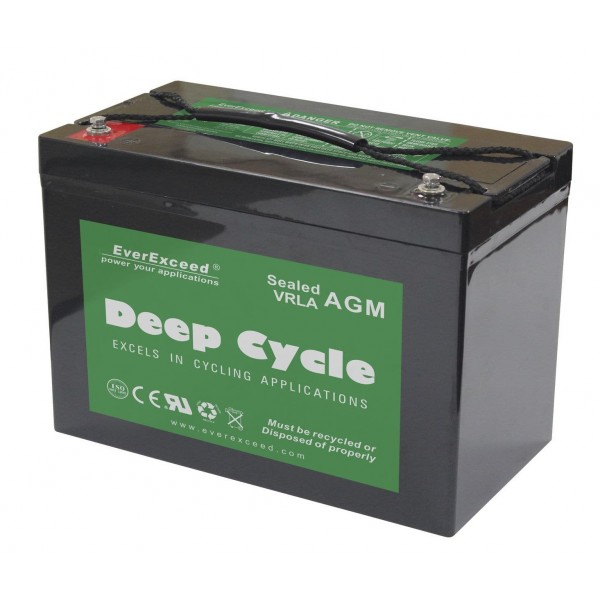 Герметичная не обслуживаемая аккумуляторная батарея EverExceed DP-12100 серии Deep Cycle с напряжением 12 вольт и электрической ёмкостью 100 Ач выполнен по современной технологии AGM нового поколения – особая чистота (99,9%) и инновационный состав активных материалов пластин аккумулятора. Что позволило улучшить основные показатели работы аккумулятора, в первую очередь циклический ресурс работы аккумулятора увеличен до 700 циклов разряда/заряда с глубиной до 100%, а также улучшились разрядно/зарядные характеристики аккумуляторов.