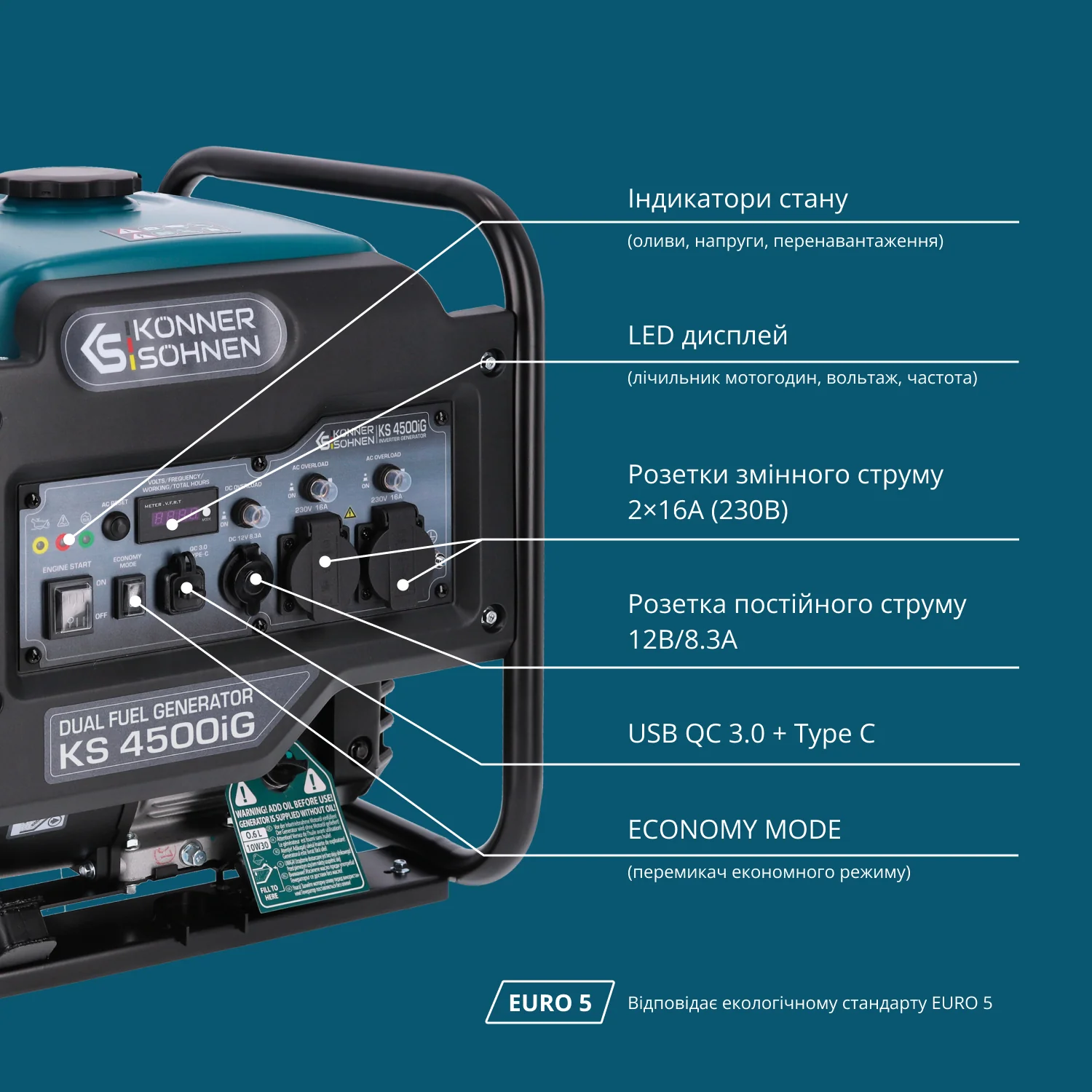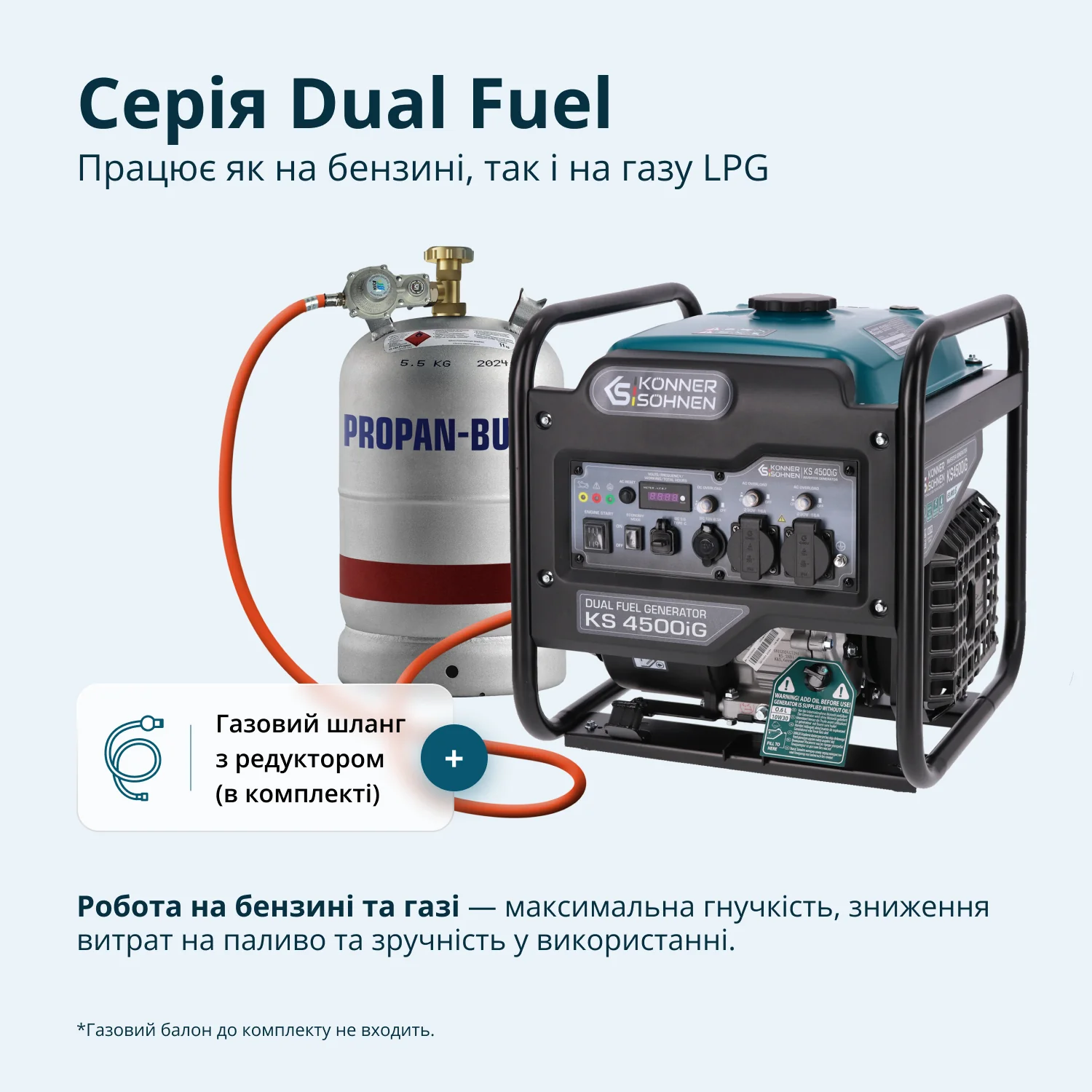 Инверторный генератор KS 4500iG — это двухтопливная модель, работающая как на бензине, так и на сжиженном газе (LPG), что обеспечивает гибкость в эксплуатации и экономию затрат. Максимальная мощность генератора составляет 4,5 кВт, номинальная — 4,2 кВт в бензиновом режиме и 3,8 кВт в газовом. Выходное напряжение — 230 В при частоте 50 Гц, что соответствует стандартным бытовым сетям.