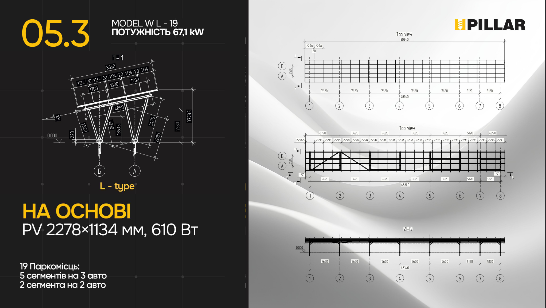Карпорт Pillar Model W L type идеально подходит для коммерческих и жилых объектов, стремящихся к устойчивому развитию и эффективному использованию пространства. Он обеспечивает не только защиту транспортных средств, но и способствует генерации чистой энергии, снижая эксплуатационные расходы и углеродный след.