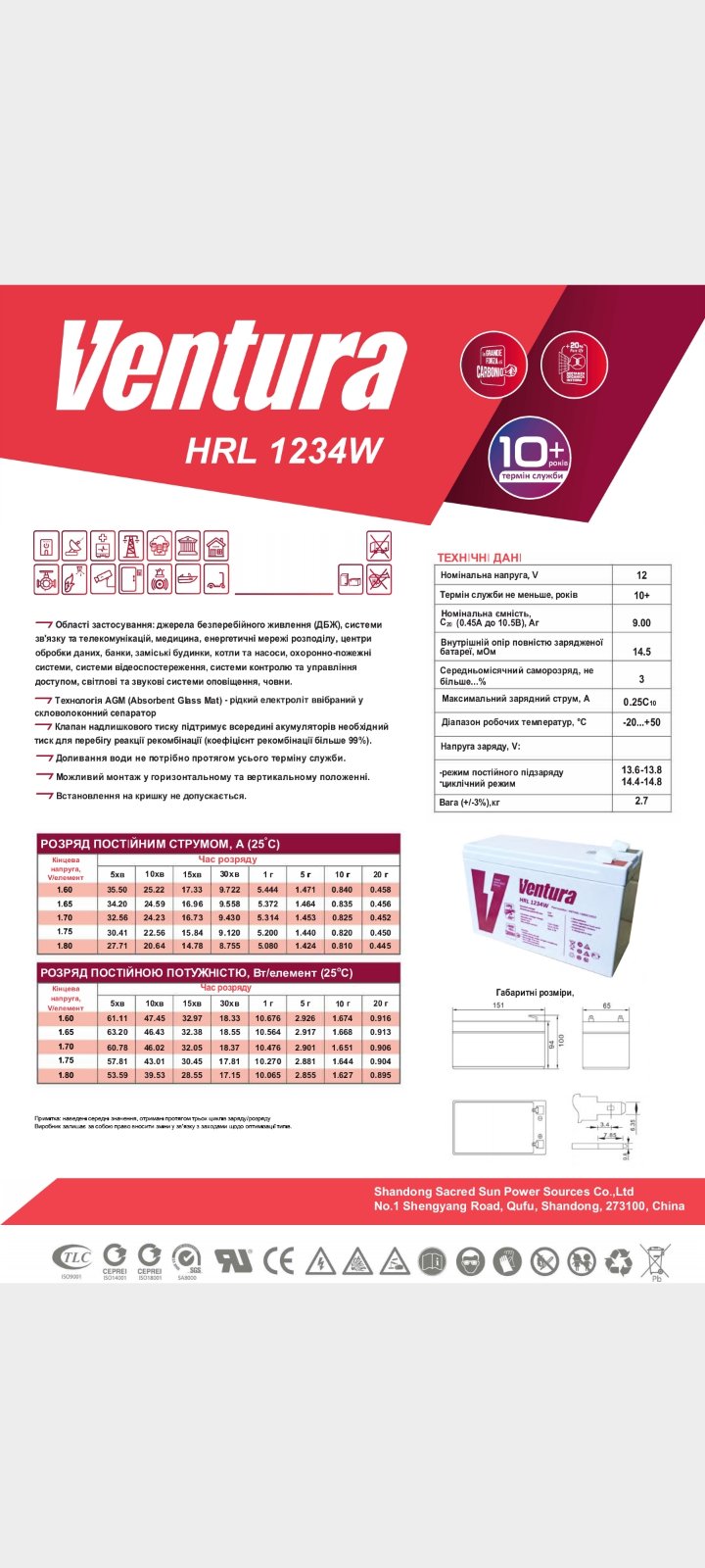 Важливо відзначити відсутність ризику протікання електроліту з герметичного корпусу АКБ, що разом з наявністю міцного і стійкого до окислення ABS-пластика в корпусі дає змогу експлуатувати акумулятор у різних умовах і просторових положеннях без особливих обмежень. Заслуговує на увагу і високий ступінь безпеки. Ventura HRL 1234W відповідає вимогам пожежної безпеки UL, а також не виділяє шкідливих речовин у навколишній простір.