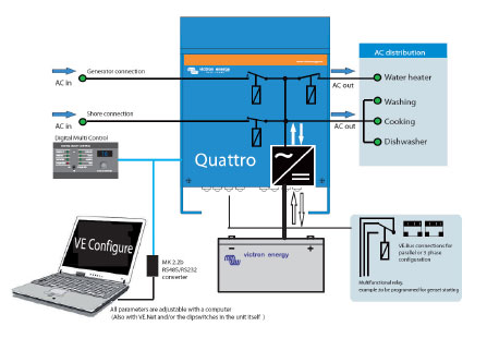Quattro являє собою комбінацію інвертера і зарядного пристрою. Крім того, пристрій може використовувати два входи змінного струму і автоматично підключатися до активного з них. Серед безлічі характеристик можна відзначити точну синусоїду інвертування, адаптивність заряду, гібридну технологію PowerAssist плюс численні можливості інтеграції в систему, наприклад, можливість роботи в режимі трьох фаз або поділу фаз і робота в паралелі.