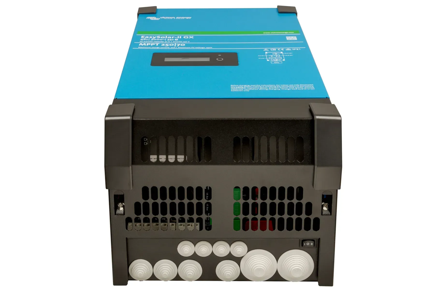 EasySolar-II 48/5000/70-50 GX — комплексне рішення «все в одному» для автономних і гібридних систем електропостачання. Пристрій поєднує інвертор MultiPlus-II 5000 ВА (4000 Вт), мережевий зарядний пристрій 48 В 70 А, MPPT-контролер SmartSolar 250/100 та вбудований GX-контролер із дисплеєм і мережевими інтерфейсами.