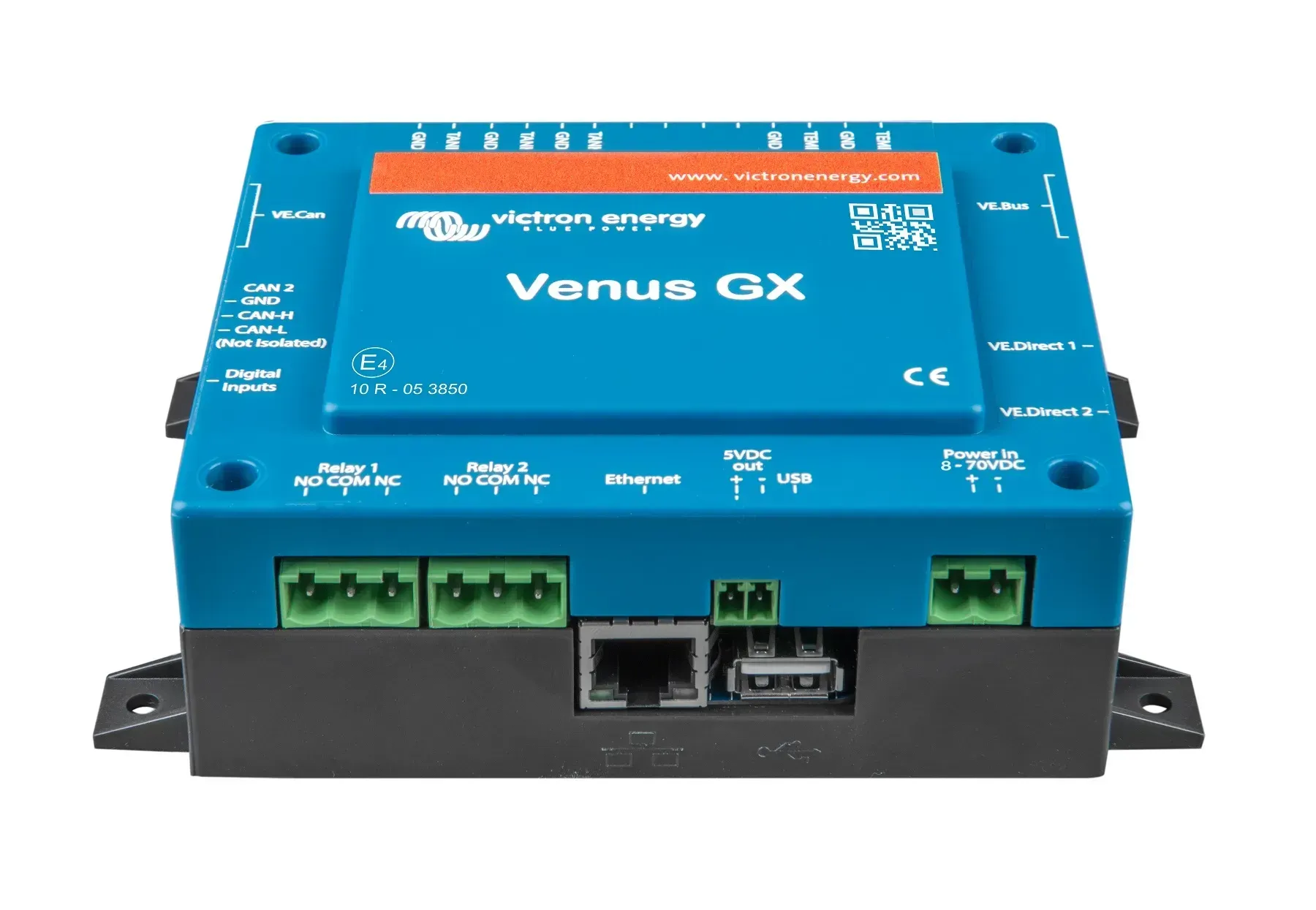 Незважаючи на компактні розміри, пристрій підтримує широкий набір інтерфейсів: VE.Direct, VE.Can, VE.Bus, USB, Ethernet, WiFi, а також релейний вихід для автоматичного запуску генератора або аварійного відключення. Передбачені входи для підключення датчиків рівня баків і температури, що розширює можливості моніторингу. Живлення в діапазоні від 8 до 70 В DC забезпечує сумісність із різними типами енергетичних систем, включаючи автономні та гібридні рішення.