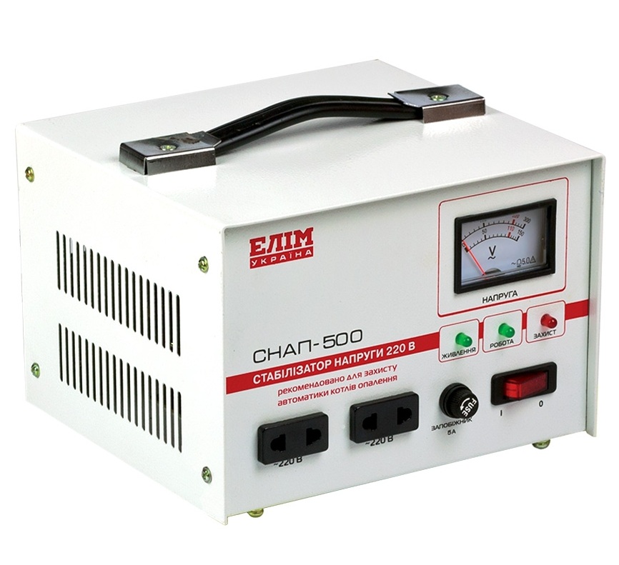 Стабілізатор напруги Elim - Україна СНАП-500 використовуються з метою забезпечення захисту і стабільної роботи різного обладнання у випадках зміни в широких межах живлячої напруги. Електромеханічні однофазні стабілізатори можуть застосовуватися для електроживлення промислового, офісного, шкільного, домашнього обладнання, а також обладнання для торгівлі, сільського господарства, бойлерних і опалювальних котлів.